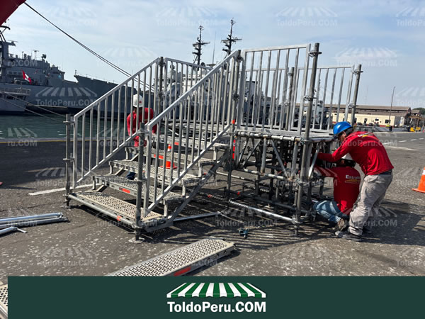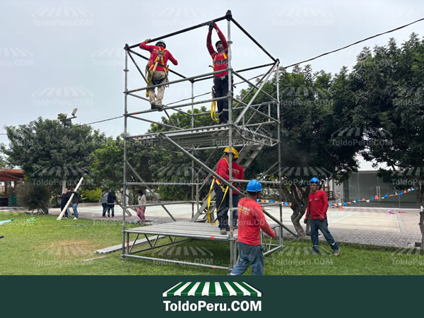 En Toldos Perú nuestros Escenarios para grandes eventos y Espectáculos se realizan con piezas de calidad Fabricado por LAYHER en acero galvanizado, aluminio de gran ligereza, paneles recubiertos con madera contrachapada resistente al clima así mismo favorece el montaje y desmontaje muy fácilmente debido a su especial diseño . Los mismos materiales básicos se emplean para montar escenarios de grandes Espectáculos. Cómo gradas, tribunas metálicas escalonadas y otras configuraciones en distintas medidas, además todos los elementos de nuestros escenarios son apilados para su fácil transporte y almacenaje.
