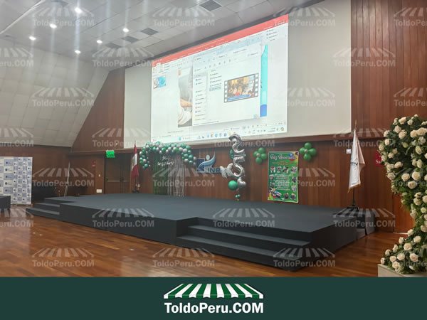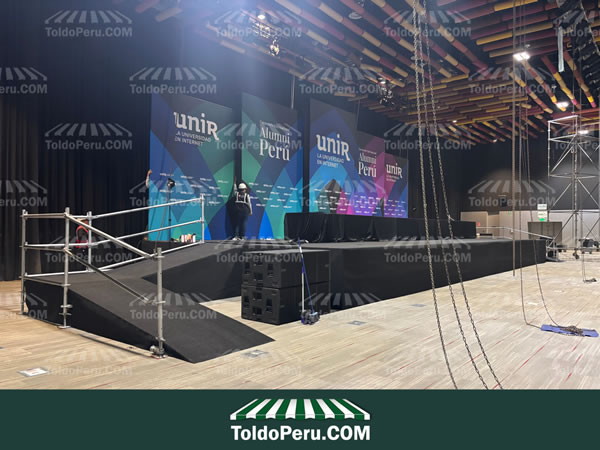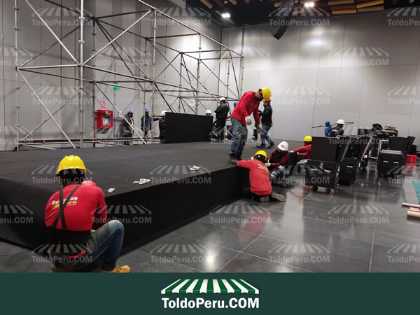 En Toldos Perú nuestros Escenarios para grandes eventos y Espectáculos se realizan con piezas de calidad Fabricado por LAYHER en acero galvanizado, aluminio de gran ligereza, paneles recubiertos con madera contrachapada resistente al clima así mismo favorece el montaje y desmontaje muy fácilmente debido a su especial diseño . Los mismos materiales básicos se emplean para montar escenarios de grandes Espectáculos. Cómo gradas, tribunas metálicas escalonadas y otras configuraciones en distintas medidas, además todos los elementos de nuestros escenarios son apilados para su fácil transporte y almacenaje.