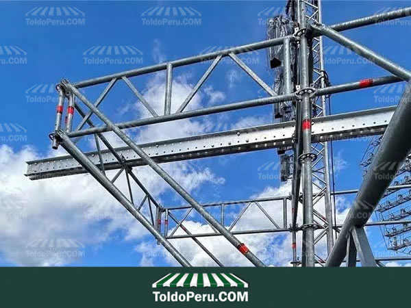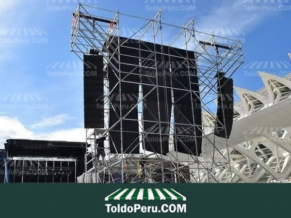 En Toldos Perú nuestros Escenarios para grandes eventos y Espectáculos se realizan con piezas de calidad Fabricado por LAYHER en acero galvanizado, aluminio de gran ligereza, paneles recubiertos con madera contrachapada resistente al clima así mismo favorece el montaje y desmontaje muy fácilmente debido a su especial diseño . Los mismos materiales básicos se emplean para montar escenarios de grandes Espectáculos. Cómo gradas, tribunas metálicas escalonadas y otras configuraciones en distintas medidas, además todos los elementos de nuestros escenarios son apilados para su fácil transporte y almacenaje.